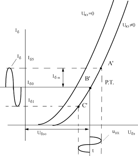 Точке А на выходных характеристиках соответствует точка А/ на входных характеристиках транзистора, определяющая максимальный ток базы. Точка B/ (рабочая точка РТ) соответствует значению тока покоя базы Iбо.