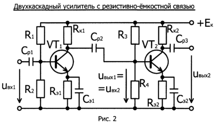 а рис. 2 изображена, принципиальная схема двухкаскадного усилителя с резистивно-емкостной (RC) связью, являющейся наиболее распространенным типом связи. Каскады соединены через разделительный конденсатор Ср2. Элементы Rэ и Сэ в цепях эмиттеров транзисторов VТ1 и VТ2 обеспечивают температурную стабилизацию режима усиления. Делители напряжения R1-R2 и R3-R4 задают величину постоянного напряжения на базах транзисторов VТ1 и VТ2 каждого каскада.