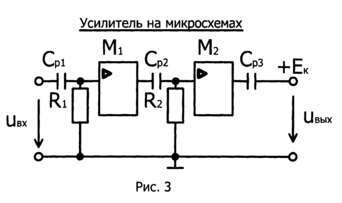 Аналогичная схема усилителя с RC-связью на микросхемах представлена на рис. 3, где в усилительных каскадах использованы операционные усилители с большим коэффициентом усиления (М1 и М2). Назначение соединительных элементов схемы аналогично усилителю на транзисторах. Коэффициент усиления этого усилителя значительно выше, чем усилителя на дискретных элементах.