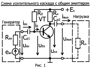 На рис. 1, приведён наиболее распространенный усилительный каскад с общим эмиттером (ОЭ) на основе биполярного транзистора n-p-n типа VT. Назначение элементов каскада: источник питания Ек (включается между клеммой +Ек и «землёй» ┴) обеспечивает режим каскада но постоянному току («режим покоя»), т.е. величины