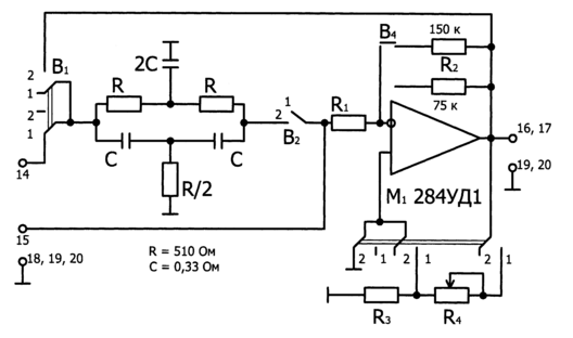 2.1. Отключить от ОУ двойной Т-образный мост, поставив переключатели В1 и В2 в положение «1», подключить к ОУ цепь ООС, поставив переключатель В4 в положение «150к» и соединить неинвертирующий вход ОУ с общим проводом, поставив переключатель В3 в положение «2».
