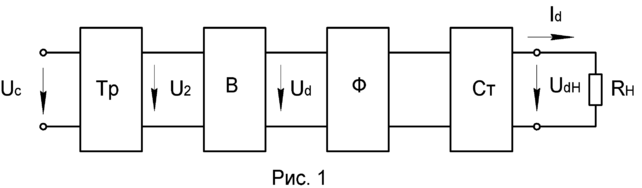 тания. Основой его является выпрямитель В, выполненный на одном или нескольких диодах, соединенных по одно- или двухполупериодным схемам. Схема также включает трансформатор Тр, согласующий напряжение сети UС с напряжением U2 на входе выпрямителя; сглаживающий фильтр Ф для сглаживания пульсаций выпрямленного напряжения Ud; стабилизатор Ст, обеспечивающий поддержание требуемой величины постоянного напряжения UdН на нагрузочном устройстве RН в условиях изменения напряжения сети и тока в RН.
