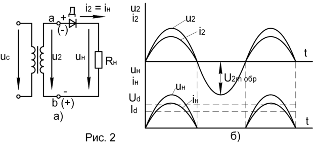 Существуют однополупериодная и двухполупериодная однофазные схемы выпрямления. Однополупериодная схема выпрямления показана на рис. 2а, а временные диаграммы тока iН и напряжения uН на нагрузочном устройстве RН – на рис. 2б.