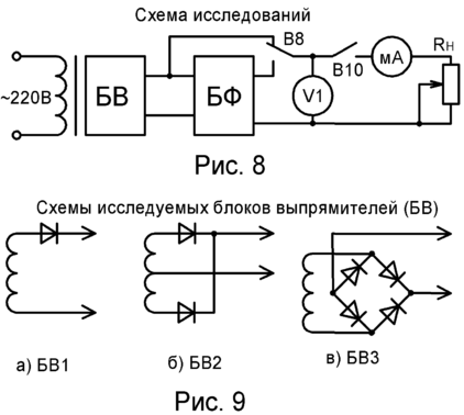 При исследовании выпрямителей плату с фильтром БФ1 не менять! Тип исследуемого фильтра и его отключение осуществляется с помощью переключателей В4, В6 и В8.