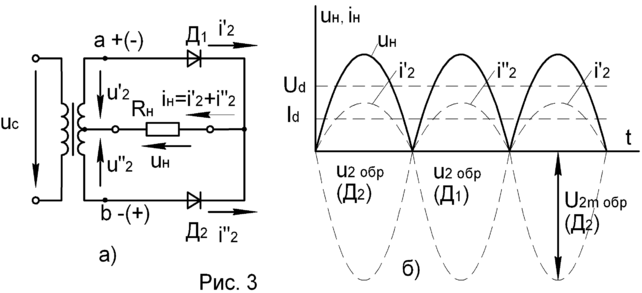 Двухполупериодная схема выпрямления с выводом средней точки вторичной обмотки трансформатора представлена на рис. 3а, а временные диаграммы напряжения uН и тока iН в нагрузочном резисторе RН – на рис. 3б.