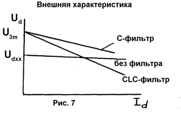 оскольку реальные трансформаторы, диоды и индуктивности имеют конечные величины внутренних сопротивлений, то с увеличением потребляемого тока Id напряжение на выходе выпрямителя уменьшается за счёт потерь напряжения в схеме. Наклон внешней характеристики зависит также и от типа фильтра (рис. 7). Выпрямленное напряжение выпрямителя с емкостным или П-образным CLC-фильтрами в режиме холостого хода (Id = 0) равно амплитудному значению выпрямляемого напряжения U3m, до которого заряжается ёмкость фильтра, а выпрямителя без фильтра – среднему значению этого напряжения. Однако, уменьшение выпрямленного напряжения в выпрямителях с фильтрами происходит более резко, чем при отсутствии фильтра.