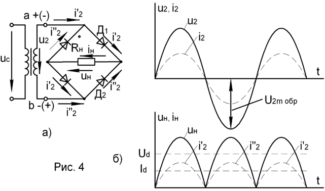 Когда точка «a» имеет положительный потенциал относительно «b», ток i2 проходит через диод Д1, нагрузочный резистор RН и диод Д3. К диодам Д2 и Д4 приложено обратное напряжение u2 ОБР. В следующий полупериод, когда «a» имеет отрицательный потенциал относительно «b», ток i2`` проходит от обмотки трансформатора через диод Д2, нагрузочный резистор RН и диод Д4. К диодам Д1 и Д3 в это время приложено обратное напряжение u2 ОБР.