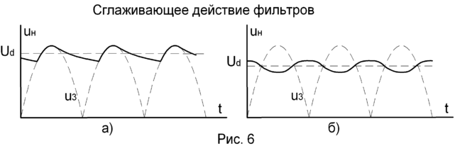 Принцип сглаживания с помощью индуктивности состоит в том, что в ней возникает ЭДС самоиндукции, препятствующая изменениям тока в цепи. Таким образом, представляя большое сопротивление для переменного тока, индуктивный элемент уменьшает переменную составляющую тока в нагрузочном устройстве.