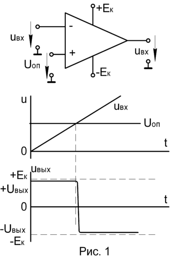 Компаратор. Компаратором называют устройство, осуществляющее сравнение измеряемого входного напряжения (uвх) с опорным напряжением (Uоп). В качестве компаратора часто используют ОУ с разомкнутой ОС (рис. 1). На вход «–» компаратора подается входной сигнал uвх, на его вход «+» – опорный сигнал Uоп. В момент равенства напряжений uвх и Uоп компаратор находится в неустойчивом линейном режиме. При превышении входным сигналом uвх значения опорного напряжения Uоп выходное напряжение компаратора изменяется от +uвх до –Uоп. Переключение компаратора происходит с некоторой задержкой, которая определяется временем перезаряда паразитных емкостей ОУ. При Uоп = 0 компаратор фиксирует момент перехода входного напряжения через нулевой уровень. В этом режиме компаратор получил название «нуль-компаратор». Если напряжения uвх и Uоп превышают максимально допустимые для данного типа ОУ уровни входных сигналов, на входе компаратора устанавливают делители напряжения.