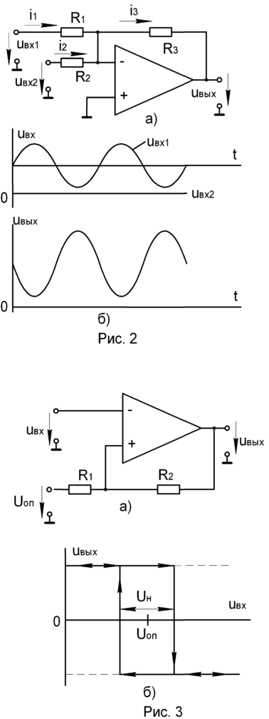При работе ОУ в импульсном режиме уровни его входных сигналов превышают значения, соответствующие линейной области амплитудной характеристики, состоящей из наклонного и двух горизонтальных участков. Импульсный режим работы ОУ характеризуется горизонтальными участками амплитудной характеристики. При изменении напряжения входного сигнала выходное напряжение ОУ остается практически постоянным и определяется напряжениями либо +uвых, либо -uвых, близкими соответственно к напряжениям +Ек и -Ек источников питания.