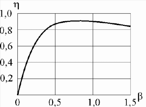 Кривая КПД, как функция полезной мощности от коэффициента нагрузки β=PЭЛ/PЭЛ (PЭЛн – номинальное значение электрической мощности), представлена на рис. 5. Возрастание кривой КПД при малых значениях полезной мощности объясняется низкими значениями потерь короткого замыкания. С ростом нагрузки влияние потерь короткого замыкания возрастает (эти потери зависят от квадрата тока нагрузки), и рост КПД замедляется.