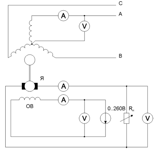 В качестве нагрузки использован двигатель постоянного тока ПЛ073У3 (220 В, 180 Вт, 1500 об./мин.). Автоматическая коммутация обмоток двигателя и подключение измерительных приборов осуществляется в блоке БПП1.