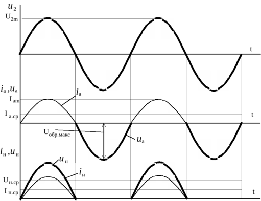 Ток через диод iа, следовательно, и через нагрузочный резистор iн появляется в те полупериоды, когда потенциал точки а выше потенциала точки б вторичной обмотки трансформатора, так как в эти полупериоды диод Д открыт. Когда потенциал точки а отрицателен по отношению к потенциалу точки б, диод закрыт, ток в цепи равен нулю. Таким образом, ток в резисторе Rн появляется только в одном из полупериодов напряжения u2, а схема называется однополупериодной. При принятых допущениях (идеальный диод) в положительный полупериод напряжения u2 величина напряжения на нагрузочном резисторе равна величине u2, а на диоде нулю, а в отрицательный полупериод uн=0, а величина uа = u2.