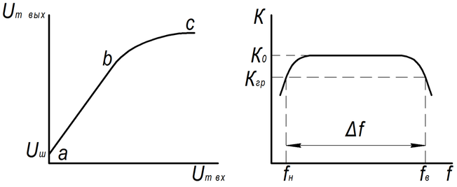Основными характеристиками усилителей являются амплитудная и амплитудо-частотная. Амплитудная характеристика усилителя – это зависимость амплитуды выходного напряжения от амплитуды входного напряжения. Эта характеристика представлена на рис. 4. Участок «ab» кривой соответствует линейному режиму работы усилителя (т.е. Uвых пропорционально Uвх, и коэффициент усиления К = const). На участке «bc» при увеличении входного напряжения появляются искажения формы выходного напряжения, называемые нелинейными искажениями, и коэффициент усиления падает. При дальнейшем увеличении Uвх выходное напряжение Uвых не меняется, усилитель работает в режиме насыщения. Рабочим участком усилителя является линейный участок характеристики «ab».