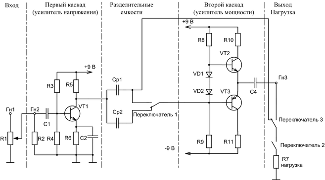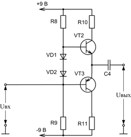 На рис. 3 показан второй (выходной) каскад усилителя, являющийся бестрансформаторным двухтактным усилителем мощности. Он собран на комплементарных транзисторах VT2 и VT3 (транзисторах разной структуры [n-p-n и p-n-p], но имеющих близкие характеристики), работающих в режимах эмиттерных повторителей напряжения (схема с общим коллектором). Режим работы по постоянному току задают делитель R8-R9 и коллекторные резисторы R10 иR11. Диоды VD1 и VD2 создают небольшое смещение напряжения для увеличения начальных токов и обеспечивают работу усилителя в режиме АВ. Начальные токи, протекающие через транзисторы VT2 и VT3,в силу разнополярности транзисторов взаимно компенсируются. Это приводит к уменьшению искажений сигнала, а также обеспечивает параметрическую температурную стабилизацию работы транзисторов. Выходное сопротивление каскада мало (порядка десятков килоом), что обеспечивает хорошее согласование с низкоомной нагрузкой.Второй каскад является усилителем тока, а его коэффициент передачи по напряжению близок к 1 (что характерно для эмиттерного повторителя), Кр>>1.