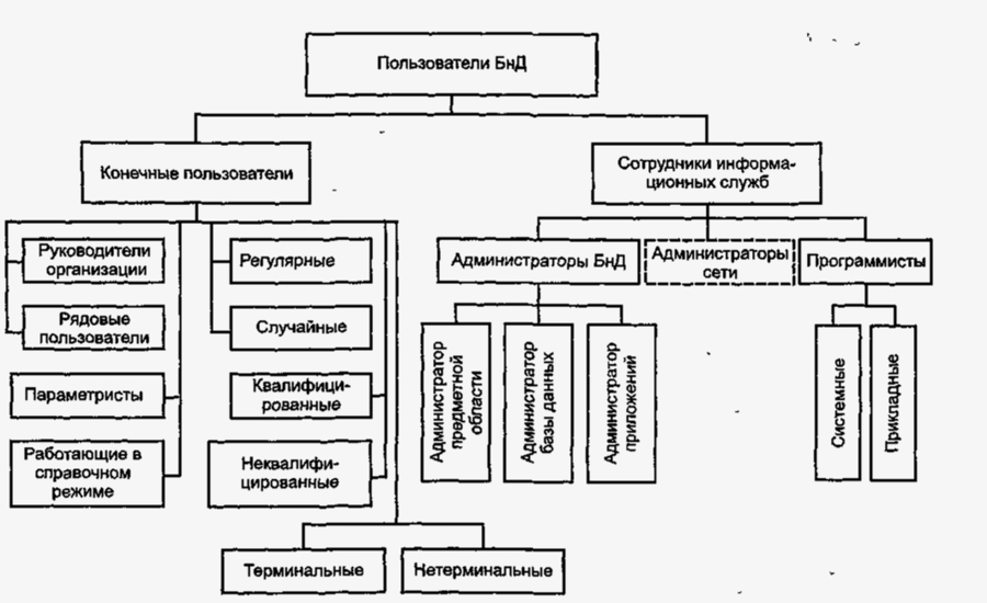 Пользователи БнД. В процессе создания и эксплуатации БнД с ним взаимодействуют пользователи разных категорий (рис. 1.1). Базы данных создаются для удовлетворения потребностей конечных пользователей. Чаще всего это специалисты конкретных предметных областей, использующие БД для выполнения своих профессиональных обязанностей. В последнее время БД все чаще применяются и для удовлетворения непроизводственных информационных потребностей. Конечные пользователи – наиболее многочисленная группа пользователей. Нельзя недооценивать важность этой группы и не понимать ее характерных особенностей.