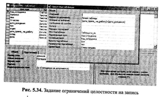 Если ограничения целостности затрагивают несколько полей одной записи, то они должны задаваться не как свойство записи, а как свойство таблицы (рис. 5.34). Чтобы попасть в окно Свойства таблицы, надо, находясь в окне конструктора таблицы, позиционироваться на заголовке этого окна, нажать правую клавишу мыши и в появившемся контекстном меню выбрать позицию Свойства.
