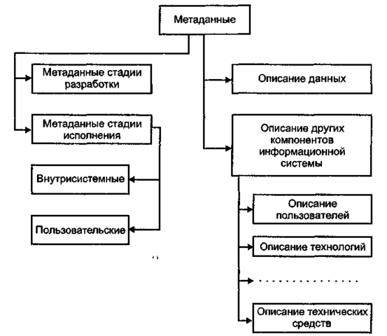 Хотя в буквальном смысле метаинформация — это информация об информации, в информационных системах это понятие трактуется более широко. Кроме описания баз данных в состав метаинформации, хранимой в БнД, может включаться информация о предметной области, необходимая для проектирования автоматизированной информационной системы, о пользователях БнД, о проектных решениях и некоторая другая информация (рис. 1.4).