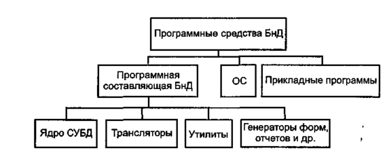 Основу программного обеспечения БнД составляют программные компоненты СУБД. Среди них можно выделить ядро СУБД, обеспечивающее создание БД, организацию ввода, обработки и хранения данных, т.е. именно то, что называется «управлением данными», а также другие компоненты, обеспечивающие настройку системы, средства тестирования, утилиты, обеспечивающие выполнение вспомогательных функций, таких, как восстановление баз данных, сбор статистики о функционировании БнД и др. Важным компонентом СУБД являются трансляторы или компиляторы для используемых ею языковых средств.