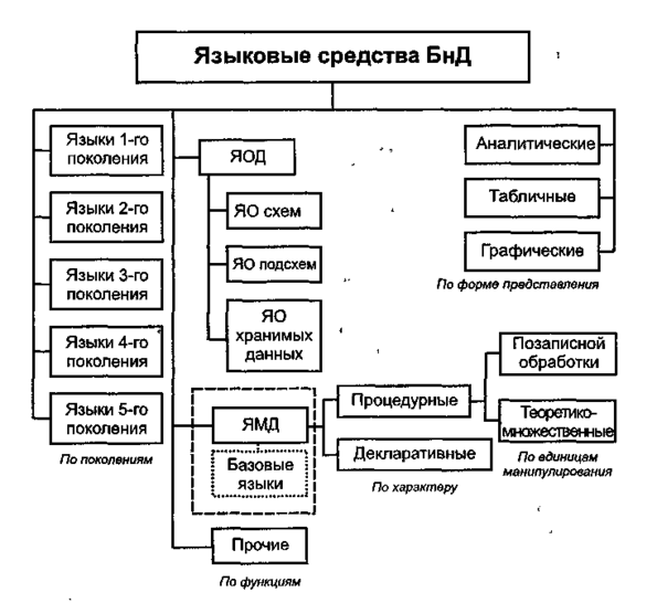 Иногда в особую группу выделяют языки запросов (ЯЗ). Первоначально под языками запросов понимали языки высокого уровня, ориентированные на конечного пользователя, предназначенные для формирования запросов к БД (в такой трактовке их можно считать одной из разновидностей ЯМД). Однако сейчас ЯЗ понимается шире (см. главу 3); многие ЯЗ включают в себя еще и возможности описания данных и корректировки БД.