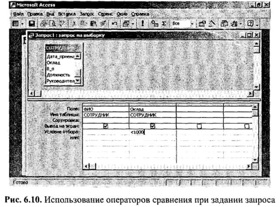 В столбце можно записывать не только значение атрибута, но и знак операции сравнения; по умолчанию принимается знак равенства (=). Если в условии отбора должны использоваться операции сравнения, отличные от знака равенства, то их надо указывать в явном виде. Если, например, требуется определить список всех сотрудников, имеющих оклад меньше 1000 руб., то запрос будет выглядеть так, как изображено на рис. 6.10.