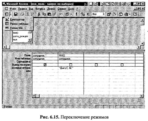 Для того чтобы посмотреть ответ, можно щелкнуть мышью по кнопке Запуск («!») на панели инструментов, либо выбрать соответствующую возможность из меню Запрос/Запуск, либо щелкнуть по стрелке на кнопке Вид и выбрать из появившегося списка вид Режим таблицы. Для того чтобы опять вернуться к построению / корректировке запроса, надо выбрать режим Конструктор (рис. 6.15).