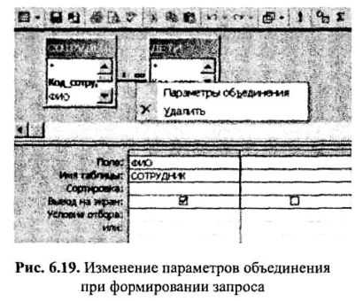 Изменить тип объединения в запросе можно, выделив нужную связь и нажав на правую кнопку мыши. В появившемся контекстном меню выбрать Параметры объединения (рис. 6.19) либо позицию меню Вид/Параметры объединения - появится окно Параметры объединения (рис. 6.20), в котором можно выбрать нужный для данного запроса тип объединения. Так, например, если требуется выдать список всех сотрудников, а для тех, кто имеет детей, - информацию о детях, то для соединения таблиц «Сотрудники» и «Дети» следует выбрать вторую альтернативу в окне Параметры объединения.