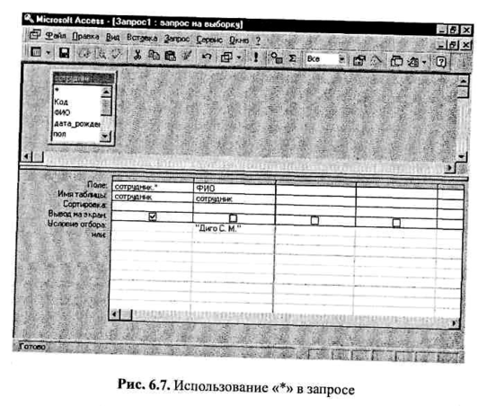Поскольку поля, включенные в запрос путем использования «*», в явном виде в бланке запроса не высвечиваются, то те поля, которые используются в условии отбора, нужно дополнительно включить в бланк запроса. Чтобы эти поля дважды не выводились в ответ, следует у этих полей снять флажок Вывод на экран (рис. 6.7).