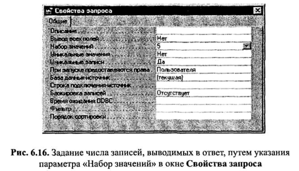 Задать число записей, выводимых в ответ, можно по-разному. Во-первых, можно позиционироваться на свободное место в верхней части окна запросов, нажать правую клавишу мыши, в появившемся меню выбрать позицию «Свойства» и в появившемся окне Свойства запроса в строке «Набор значений» указать требуемое значение (рис. 6.16). Число записей, выводимых в ответ, можно указать не только в абсолютных величинах, но и в процентах.