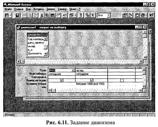 В условиях отбора можно задавать и диапазон значений. В этом случае запрос будет выглядеть подобно тому, как изображено на рис. 6.11.