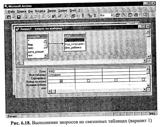 Надо осторожно относиться к формированию запросов к связанным таблицам. Как вы думаете, что будет получено в ответ на запрос, изображенный на рис. 6.18? На самом деле ответить на этот вопрос, не имея дополнительной информации, нельзя. Необходимо знать, каковы параметры объединения (если вы внимательны, то по виду линии сможете определить вид связи) и какие значения имеют свойства «Уникальные записи» и «Уникальные значения» (этого на схеме не видно). Если задано обычное («внутреннее») соединение таблиц и для свойства «Уникальные значения» задано значение «Да», то в ответ на запрос, содержащий в бланке запроса поле «ФИО» и больше ничего, будет получен список сотрудников, имеющих детей.