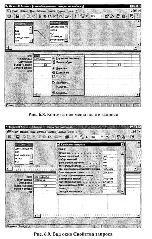 В том случае, если в ответ выводятся не все поля исходной таблицы, может случиться, что строки в ответе могут быть повторяющимися. Для того чтобы управлять выводом повторяющихся строк, можно позиционироваться на произвольное место вне бланка запроса и списка полей, нажать правую кнопку мыши и в появившемся контекстном меню (рис. 6.8) выбрать строку «Свойства» (либо выбрать соответствующую кнопку на панели инструментов). Среди свойств запроса (рис. 6.9) есть два: «Уникальные записи» (UniqueRecords) и «Уникальные значения» (UniqueValues), которые служат указанным целям. Если вы хотите, чтобы в ответ выдавался список кафедр без повторов, задайте для свойства «Уникальные значения» значение «Да».