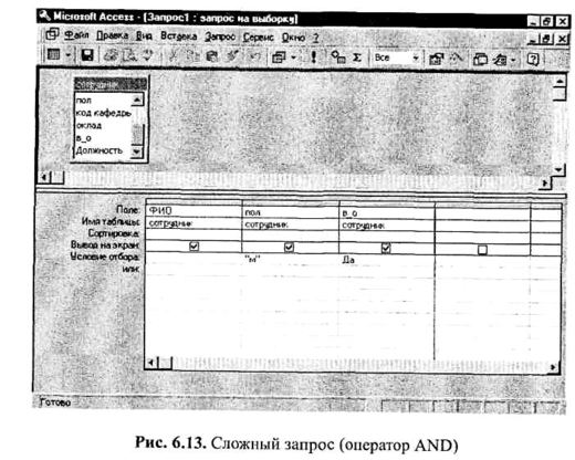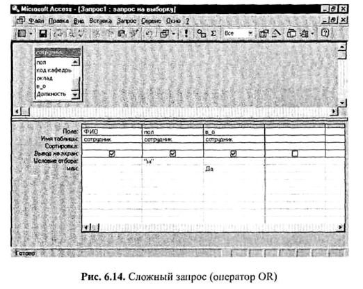 Если в условиях отбора используется несколько полей, то они могут соединяться оператором «И» или «ИЛИ». На рис. 6.13, 6.14 изображены примеры таких запросов. Первый из них выдает список военнообязанных мужчин (запрос «И»; аргументы запроса расположены на одной строке), второй (запрос «ИЛИ»; аргументы запроса расположены на разных строках) - всех мужчин и военнообязанных женщин.