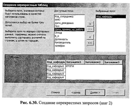 В качестве заголовков строк будет использоваться «Код_кафед-ры». Для того чтобы задать это, нужно позиционироваться на этом поле и щелкнуть по кнопке, после чего экран примет вид, представленный на рис. 6.30.