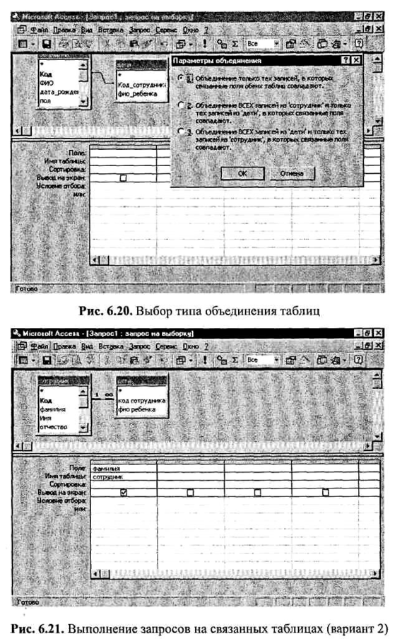 Если будет использовано внутреннее соединение (а оно задается по умолчанию), то такие сотрудники не попадут в ответ (т.е. результат ответа будет не соответствовать действительности). На результат запроса «Выдать список сотрудников, имеющих больше двух детей» параметры объединения таблиц не окажут влияния.