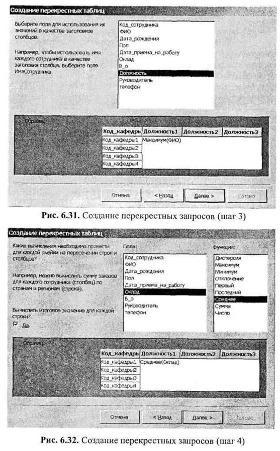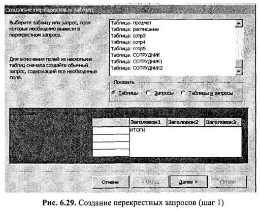 Для создания перекрестного запроса следует воспользоваться позицией «Перекрестный запрос» в окне Новый запрос {см. рис. 6.5) или выбрать соответствующую строку в меню Запрос. Далее необходимо выполнить ряд шагов, предлагаемых мастером по созданию перекрестных запросов.