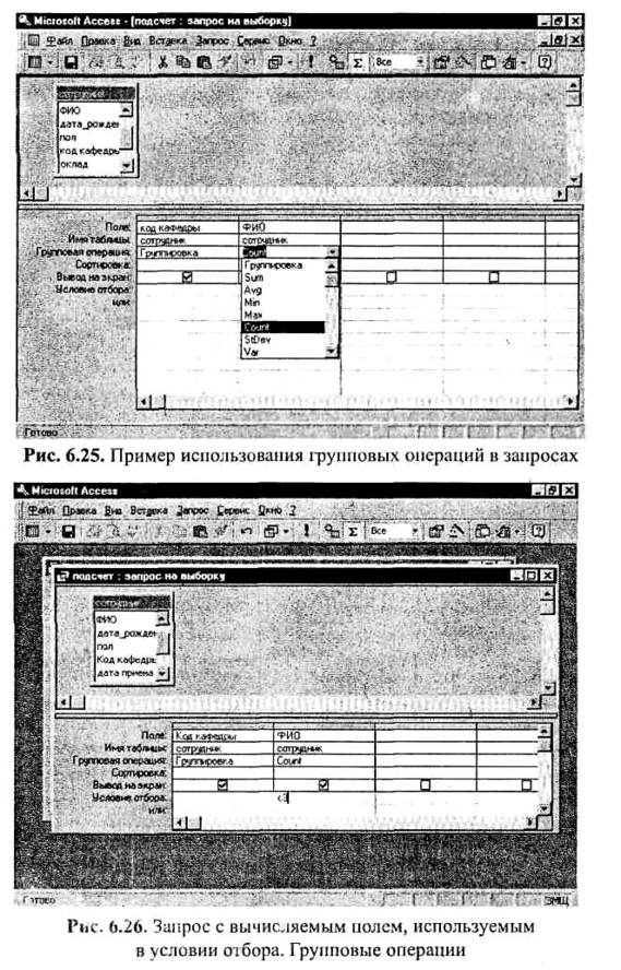 В бланке запроса задают также условия отбора, с помощью которых определяются группы, для которых вычисляются итоговые значения, записи, включаемые в вычисления, или результаты, отображаемые после выполнения расчетов. На рис. 6.26 изображен запрос, в котором условия отбора применены к вычисляемому полю («Выдать список кафедр, на которых работает меньше трех человек»).