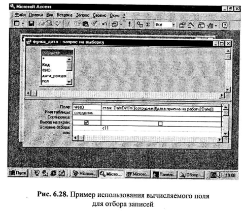 Результаты вычислений не обязательно должны отображаться в ответе. Их можно использовать, например, в условиях отбора для определения записей, которые выводятся в ответ, но само вычисляемое поле в ответ при этом не выводится. Для того чтобы поле в ответ не выводилось, необходимо для него снять значок «V» в строке «Вывод на экран» бланка запроса. Так, на рис. 6.28 изображен запрос: «Выдать список сотрудников, работающих меньше 11 месяцев».