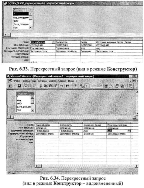 Перекрестные запросы служат для более компактного отображения информации (схожего с изображением в электронных таблицах). В перекрестном запросе отображаются результаты статистических расчетов (такие, как суммы, количество записей, средние значения), выполненных по данным из одного поля. Эти результаты группируются по двум наборам данных в формате перекрестной таблицы. Пер-: вый набор выводится в левом столбце и образует заголовки строк, а второй - выводится в верхней строке и образует заголовки столбцов.