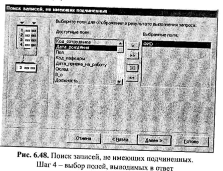 Затем выбираются поля, которые должны войти в ответ (рис. 6.48). Поскольку необходим просто список сотрудников, в ответ выводится только поле «ФИО».