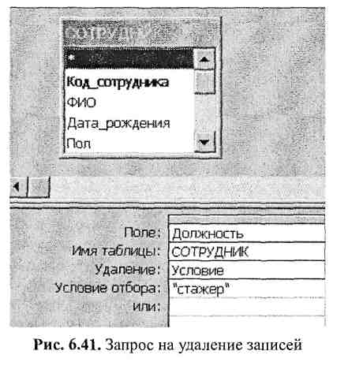 На рис. 6.41 изображен запрос, приводящий к удалению из таблицы «Сотрудник» записей, соответствующих стажерам.