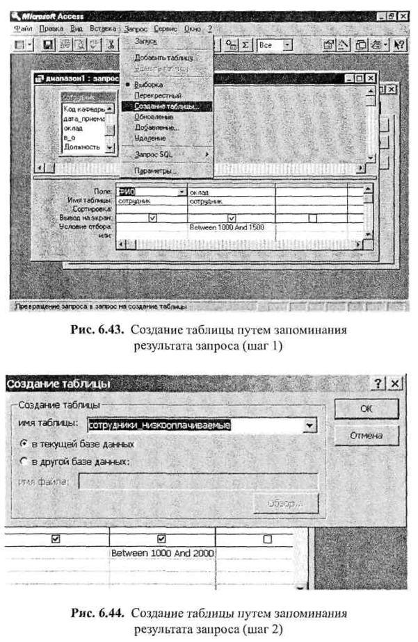 Запрос на создание таблицы фактически означает запоминание результата запроса в таблице. Чтобы использовать такую возможность, необходимо создать запрос, результат которого следует поместить в новую таблицу. Затем в режиме конструктора запроса нужно выбрать Тип запроса/Создание таблицы (рис. 6.43).
