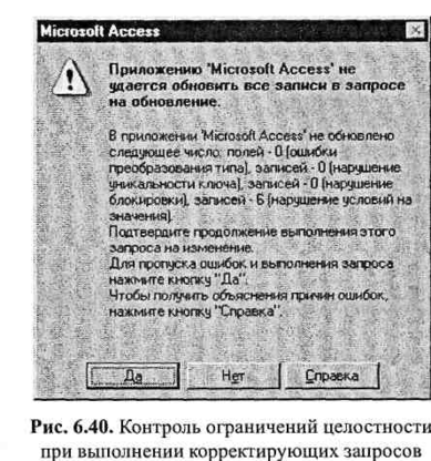При выполнении корректирующих запросов система осуществляет контроль ограничений целостности. Так, например, если при описании таблицы было задано ограничение на максимально допустимое значение поля «Оклад», то при выполнении запроса (см. рис. 6.38) в случае нарушения ограничения может быть выдано сообщение, подобное приведенному на рис. 6.40. Если выбрать вариант «Да», то для записей, нарушающих ограничение на значение, корректировка вообще выполнена не будет. В нашем примере такой выбор будет неправильным, поскольку в этом случае у одних сотрудников зарплата будет повышена, а у других - нет. Причем потом разобраться, у кого она была повышена, а у кого - нет, будет практически невозможно. В рассматриваемой ситуации следует отказаться от выполнения запроса, скорректировать при необходимости ограничение на значение и только после этого выполнить запрос.