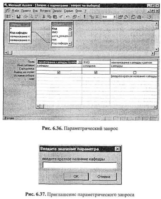 На рис. 6.36 представлен параметрический запрос для получения списка сотрудников заданной кафедры. При запуске этого запроса на исполнение будет появляться окно с подсказкой (рис. 6.37), в которое нужно ввести требуемое значение параметра.