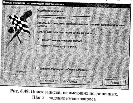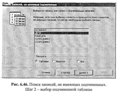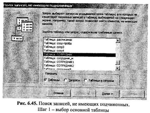 Для того чтобы воспользоваться возможностью поиска записей, не имеющих подчиненных, можно выбрать Мастер «Записи без подчиненных» в окне Новый запрос (см. рис. 6.5).