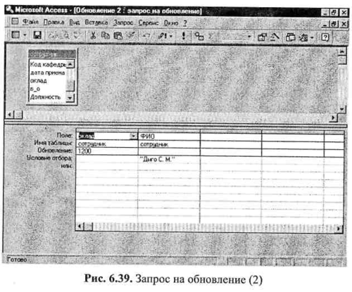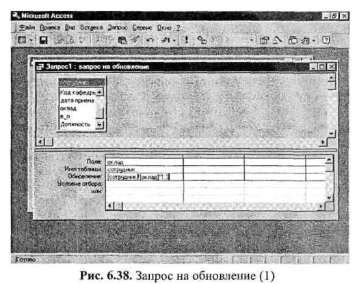 Корректирующие запросы на обновление и удаление могут изменять как все записи таблицы, так и определенное их подмножество -это будет зависеть от условия отбора. Так, например, запрос, приведенный на рис. 6.38, увеличит зарплату всех сотрудников на 30% (так как условие отбора не задано). Запрос, изображенный на рис. 6.39, изменит зарплату одного конкретного сотрудника (см. условие отбора данного запроса) и установит для нее значение, указанное в запросе.