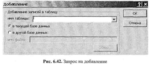 Запрос на добавление. Он добавляет группу записей из одной или нескольких таблиц (таблиц-источников) в конец другой таблицы (результатной таблицы). Для задания запроса такого типа следует сначала создать запрос, содержащий таблицу (таблицы), записи из которой необходимо добавить в другую таблицу. Затем в режиме Конструктор запроса нужно нажать стрелку рядом с кнопкой Тип запроса на панели инструментов и выбрать команду Добавление (либо выбрать соответствующую позицию в меню Запросы). На экране появится диалоговое окно Добавление (рис. 6.42). В поле «Имя таблицы» следует ввести имя таблицы, в которую необходимо добавить записи.