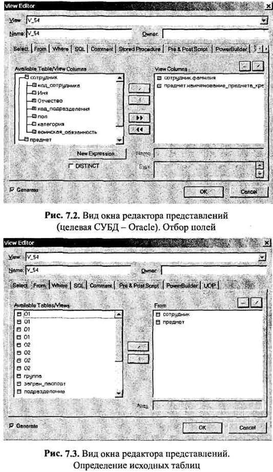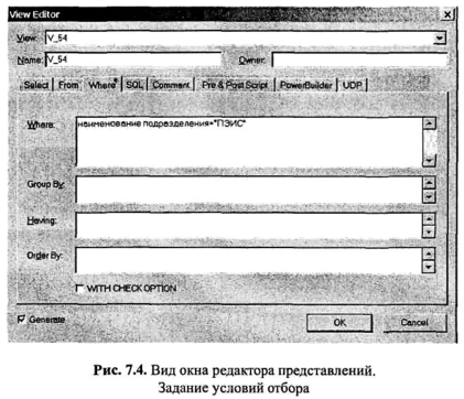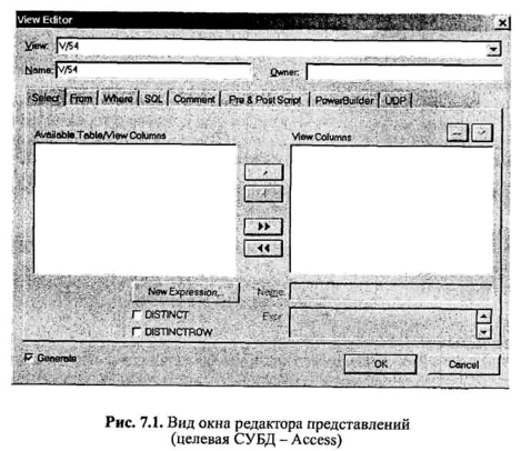 Поскольку в целевой СУБД представление реализуется в виде оператора SQL, а, как известно, диалекты SQL различаются в разных СУБД, то и окна редактора представлений несколько различаются в зависимости от выбранной целевой СУБД. Для сравнения на рис. 7.1 представлен вид окна для целевой СУБД Access, а на рис. 7.2 - для целевой СУБД Oracle.