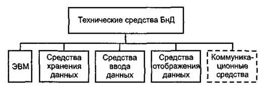 Совокупность типов технических средств, на которых реализуются БнД, не отличается от всех иных автоматизированных ИС (рис. 1.8). Это ЭВМ, периферийные средства для ввода информации в базу данных, средства хранения данных и средства отображения выводимой информации. Если банк данных реализуется в сети, то необходимы соответствующие технические средства (показано пунктиром) для обеспечения ее работы. Но банки данных предъявляют свои требования к используемым техническим средствам.