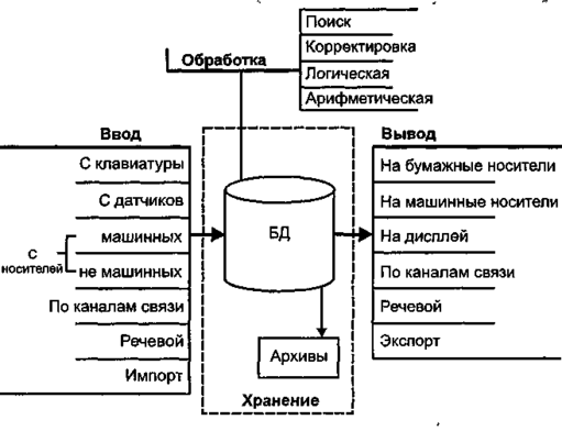 В банках данных, так же как и во всех других информационных системах, выполняются операции по вводу, хранению, обработке и выводу информации (рис. 1.10). При выполнении каждой из этих операций могут использоваться различные технологии и, как следствие, различные технические и программные средства для их поддержания.